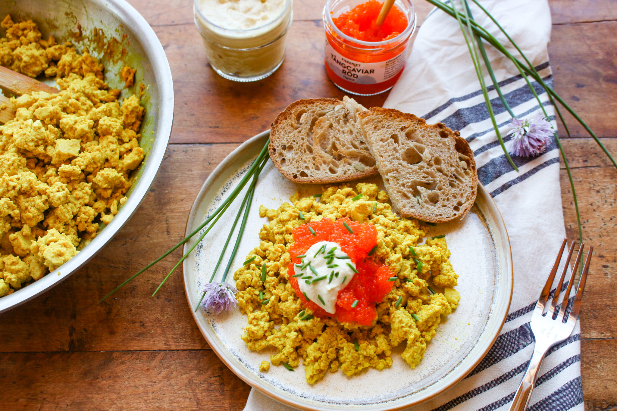 Vegan Tofu Scrambled Eggs with Caviar and Toast
