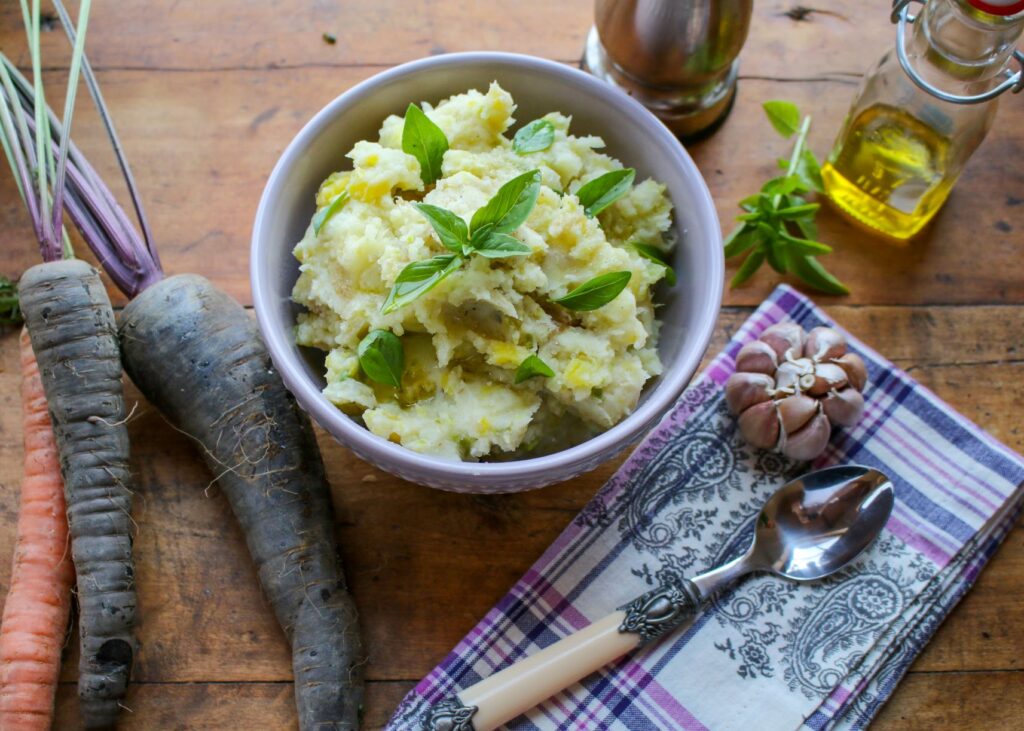 Mashed Potatoes and Heirloom Carrots with Basil, Garlic, and Olive Oil