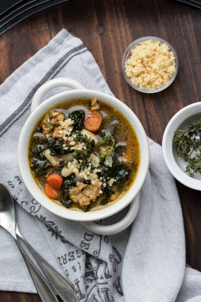 Vegan Sausage, Kale and White Bean Soup, Sophia Tsoukas DeSantis, Veggies Don’t Bite (shown above)