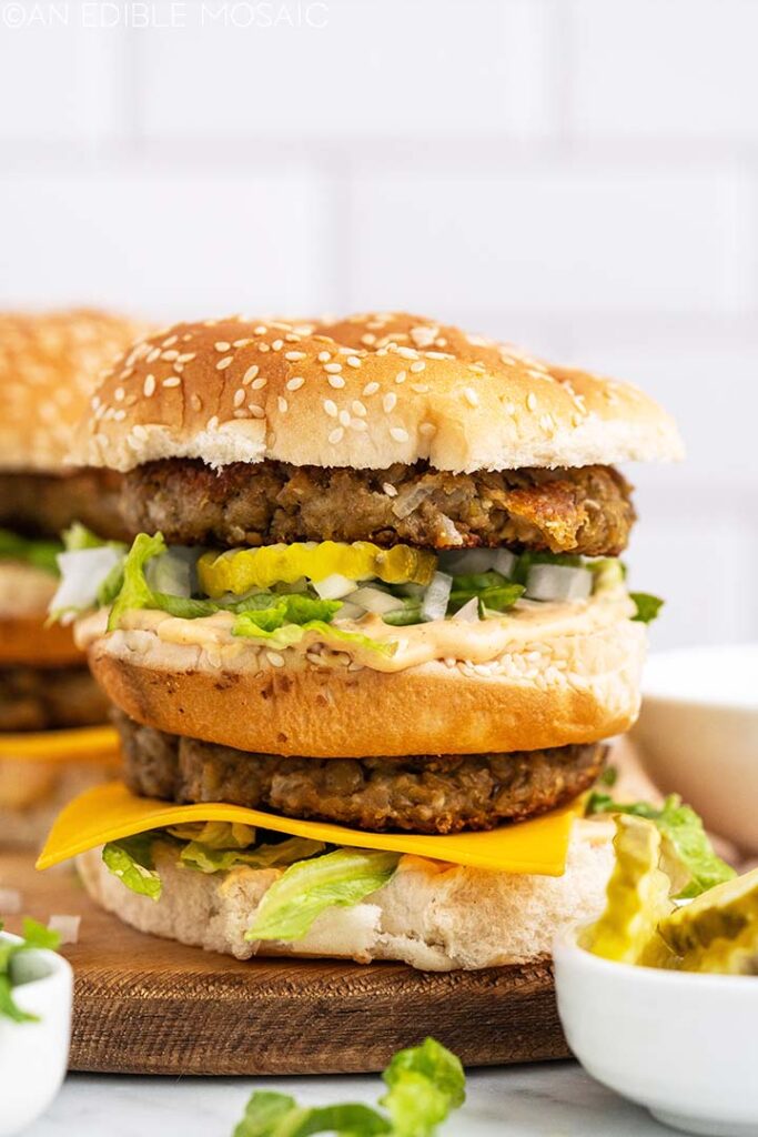 Vegan Big Mac Lentil Burgers and Special Sauce (McDonald’s copycat), Faith Gorsky, An Edible Mosaic (shown above)