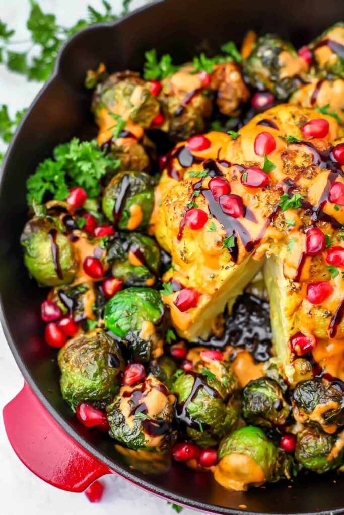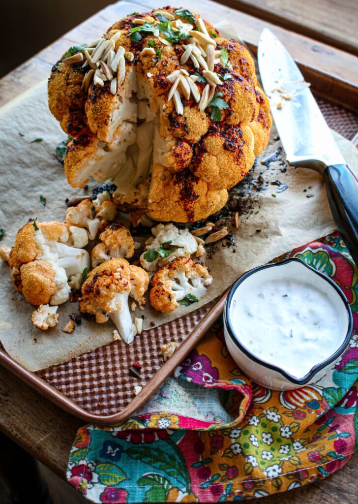 Whole Roasted Cauliflower with Shawarma Spice and Herbed Vegan Yogurt, Sharon Palmer, MSFS, RDN, The Plant-Powered Dietitian (shown above)