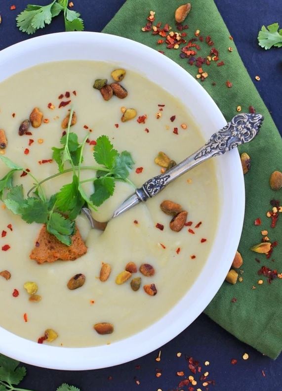 Creamy Vegan Cauliflower Soup with Spicy Pistachio Pesto, E.A. Stewart, Spicy RD Nutrition (shown above)