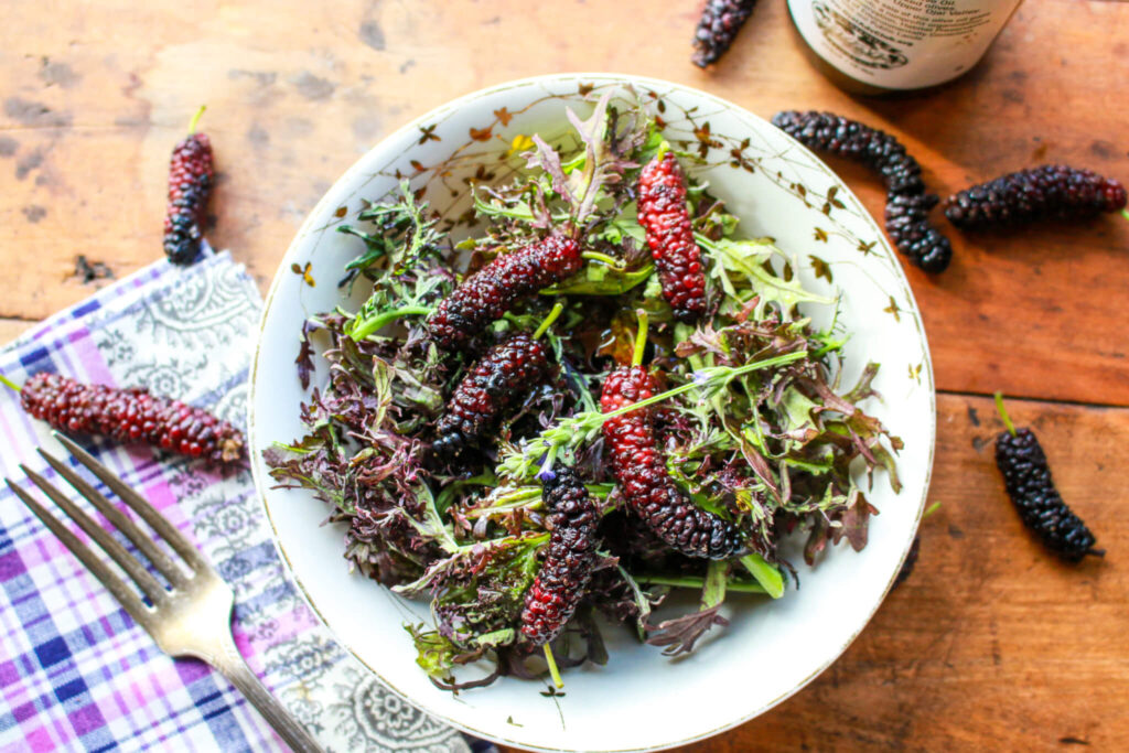 2. Beautify Salads. Mulberries are irresistibly pretty! Black or red, they bring a happy burst of brightness to lots of dishes, but they pair especially well in seasonal salads. Make mulberries the inspiration for your next fruit salad by choosing fruits of contrasting colors, degrees of sweetness, and texture. The novelty of this underutilized berry will make an otherwise common salad a crowd pleaser. Give them a try in green salads made with spinach, kale, butter lettuce, or mixed greens, which are just asking for the sweet-tartness of mulberries. Toss with a light citrus vinaigrette—that’s it!