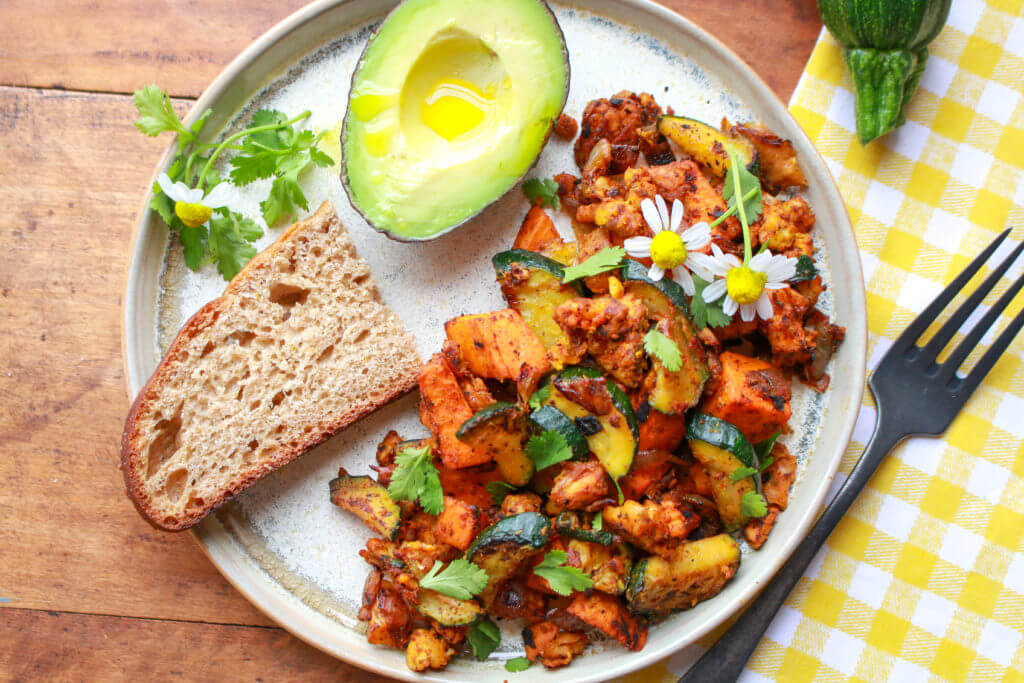 - Breakfast: Tempeh Sweet Potato Breakfast Hash, Grapefruit Half, with Coffee