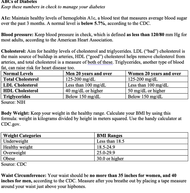 We want to control blood glucose levels and keep A1C levels in a healthy range, and also prevent complications that frequently occur as a side effect of diabetes: 63% of people with diabetes have hypertension, 56% have dyslipidemia, 18% are obese, and half will die of CVD (especially heart disease and stroke). It can damage organs, like kidneys, eyes, and nerves. It raises the risk for Alzheimer’s and certain types of cancer. By keeping your diabetes under control, you can reduce these complications.