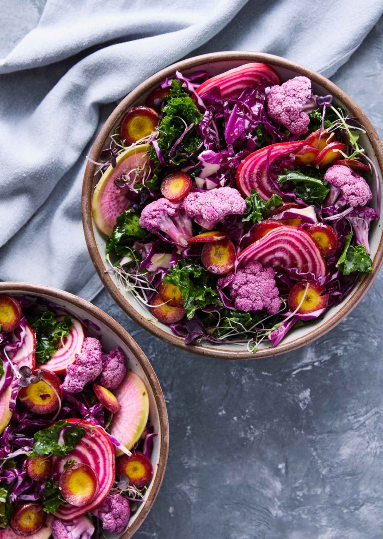 Some of my favorite recipes include: Sicilian Caponata, Broccoli Leek Soup, Raw Purple Power Salad, Shawarma-Inspired Cauliflower & Bulgur Bowls, Spanish-Style Vegetable Paella, Grilled Herb Spring Vegetables, and Old-Fashioned Tropical Ambrosia.