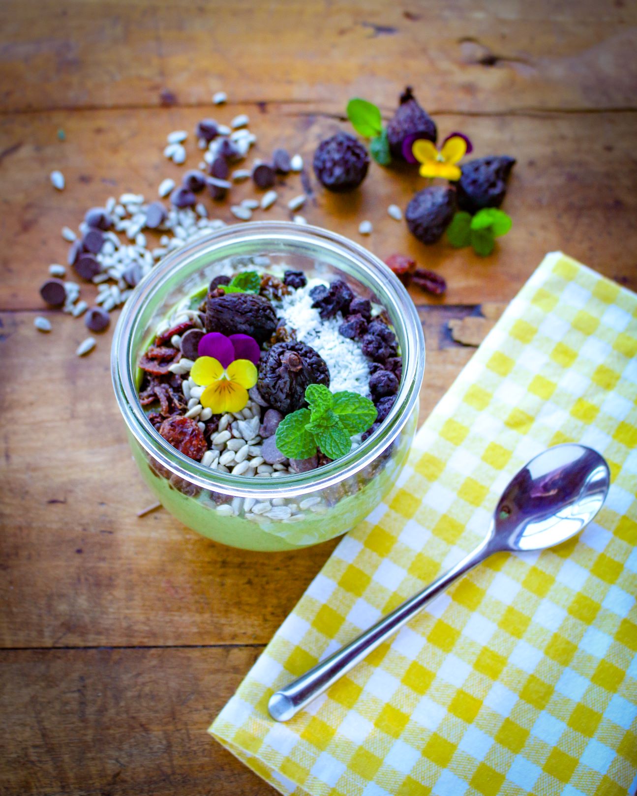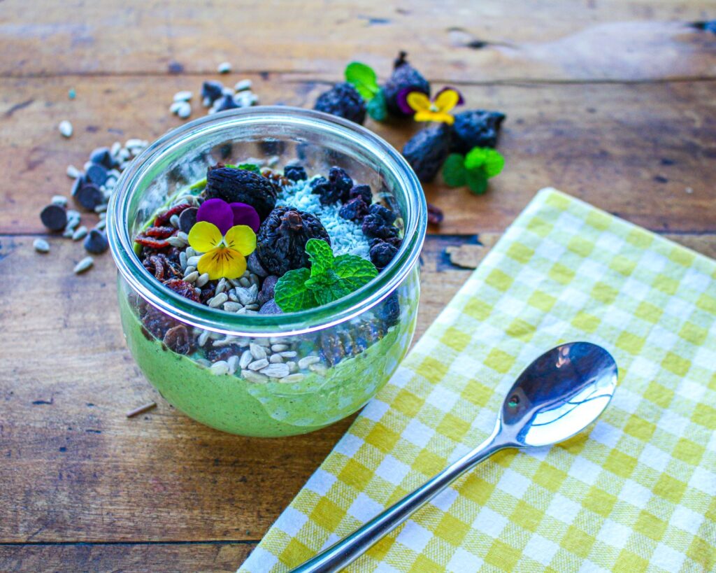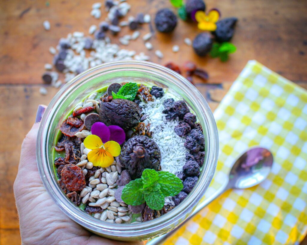 - Arrange toppings over the smoothie. Choose desired dried fruit and seeds to arrange over the top of the smoothie bowl, then arrange shredded coconut and dark chocolate chips.