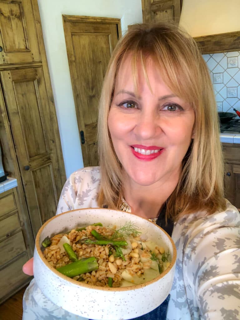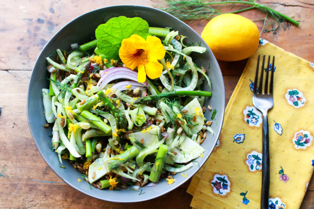 This healthy, hearty recipe for Tuscan Spring Salad with Farro, Steamed Asparagus, Fennel, and Pine Nuts combines all of the flavors of the Tuscan countryside, including fennel, onion, olive oil, lemons, and pine nuts, into one easy, satisfying grain salad perfect for meal prep, easy dinners, and potlucks.