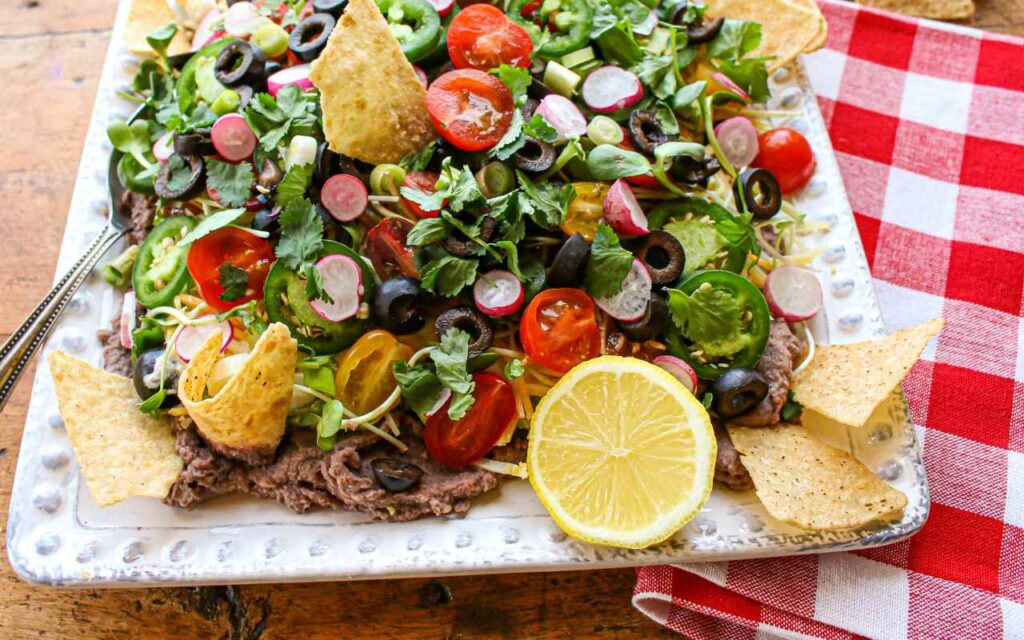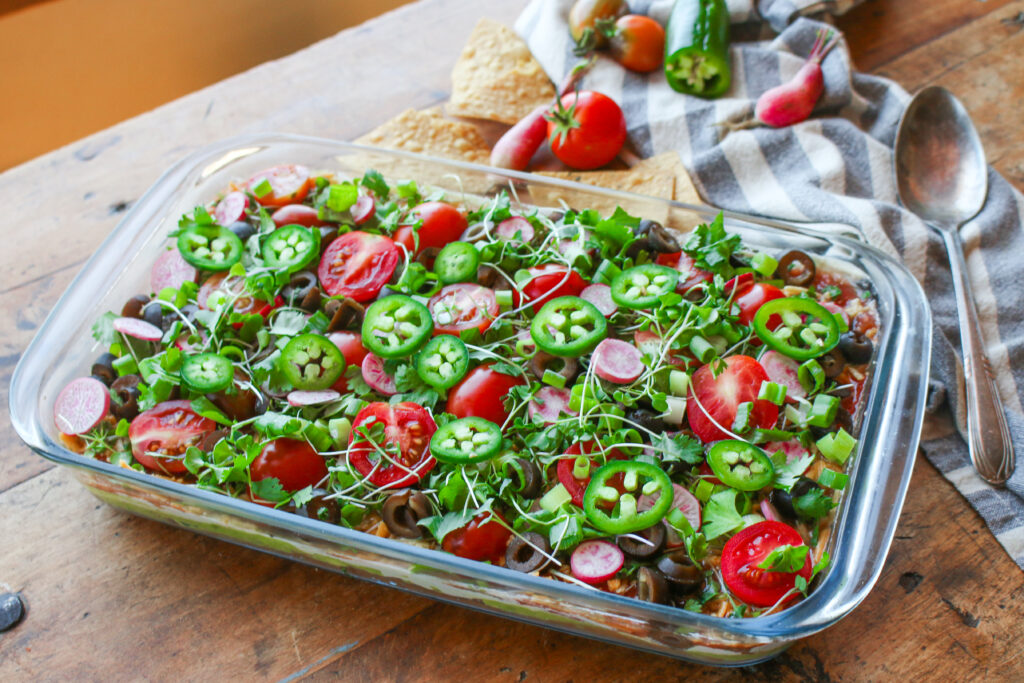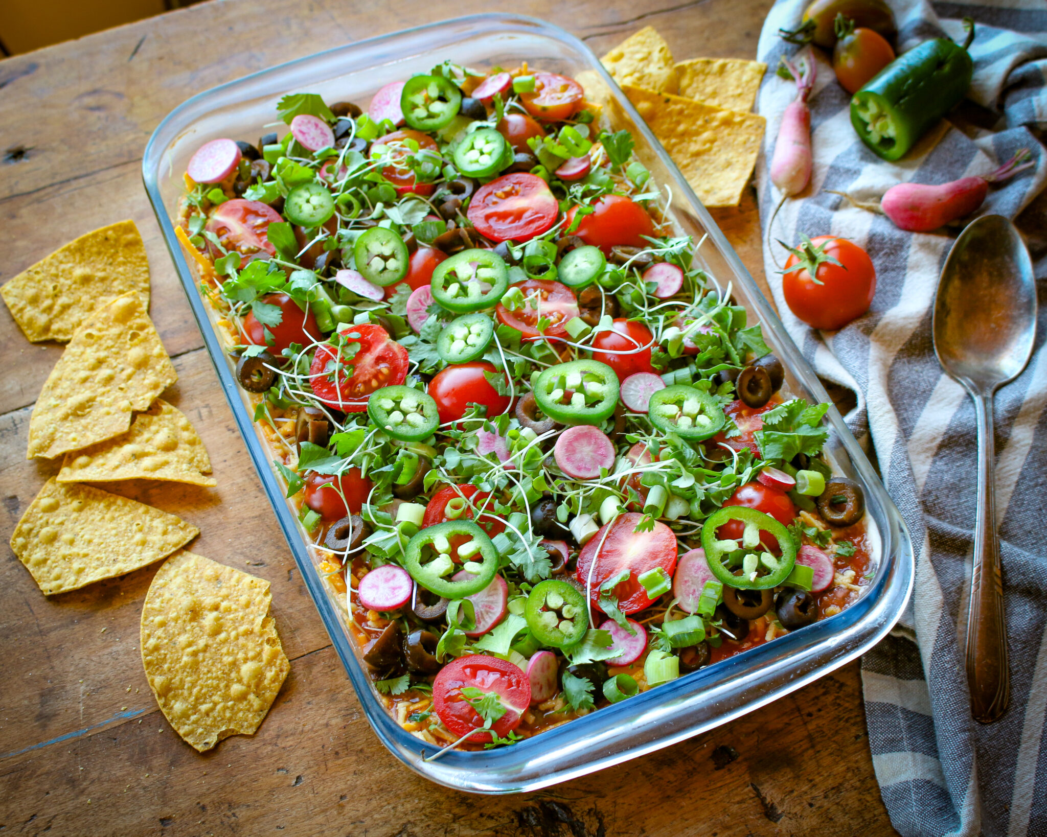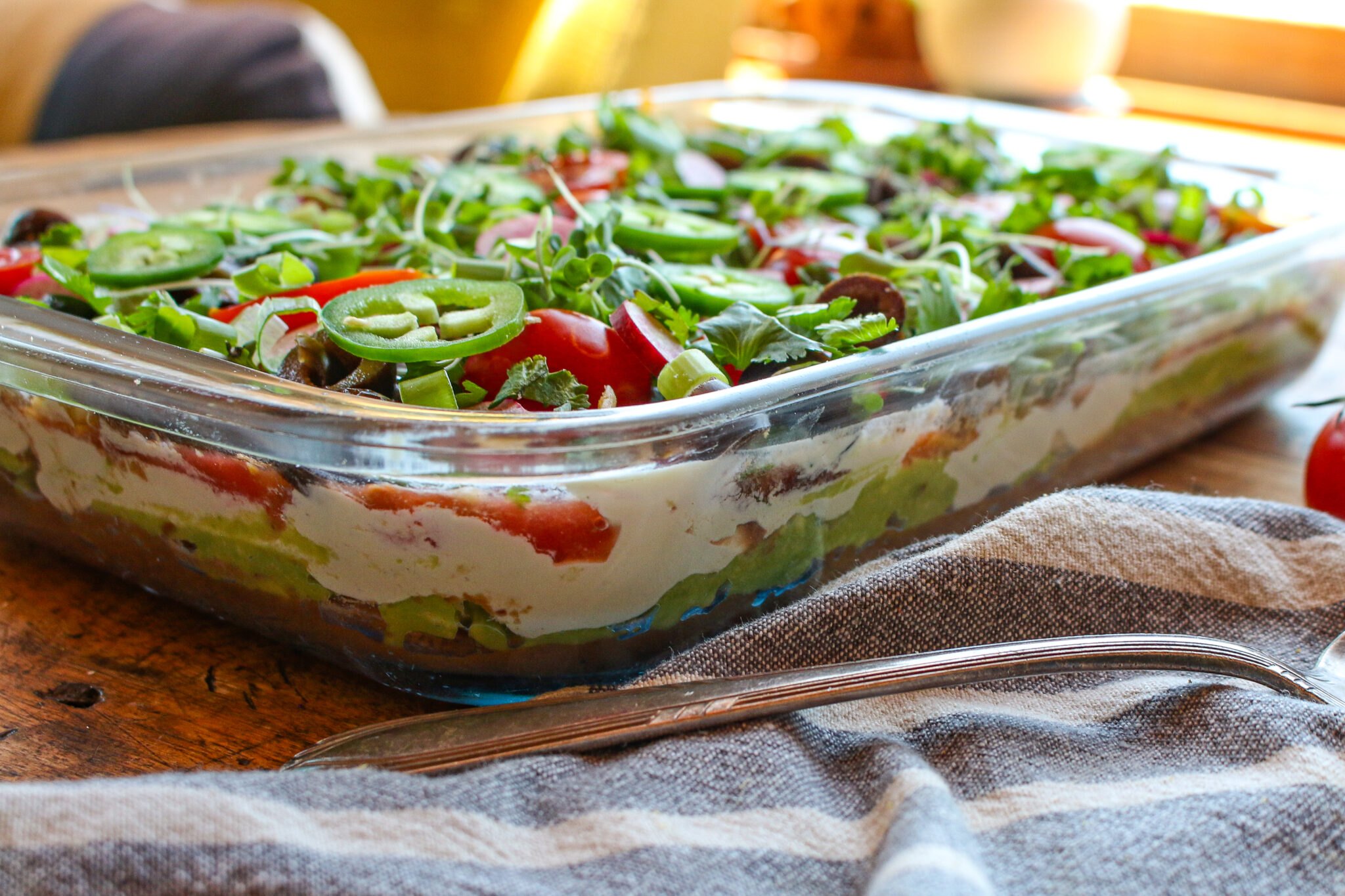 This fabulous easy Vegan 7 Layer Dip is packed with healthful, wholesome ingredients–black beans, avocados, homemade cashew cream, salsa and a salad topping filled with vibrant, fresh garden vegetables.