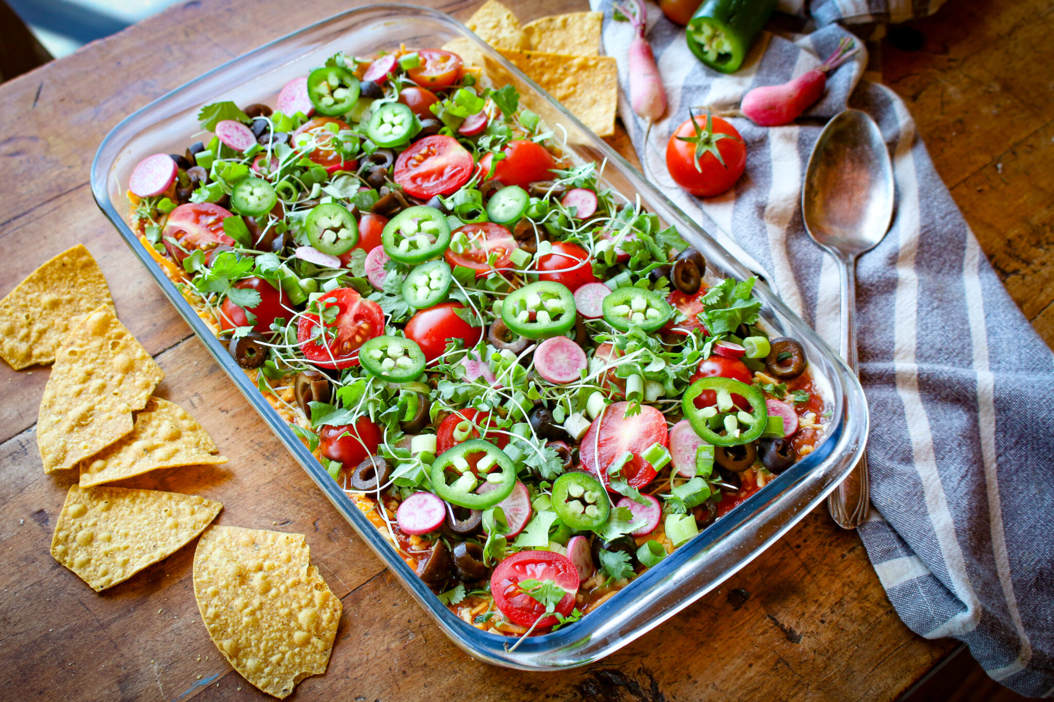 - Immediately serve the 7 layer dip platter with baked tortilla chips, flatbread, whole grain crackers, and/or sliced vegetables, as desired. May refrigerate up to 3 days by covering.