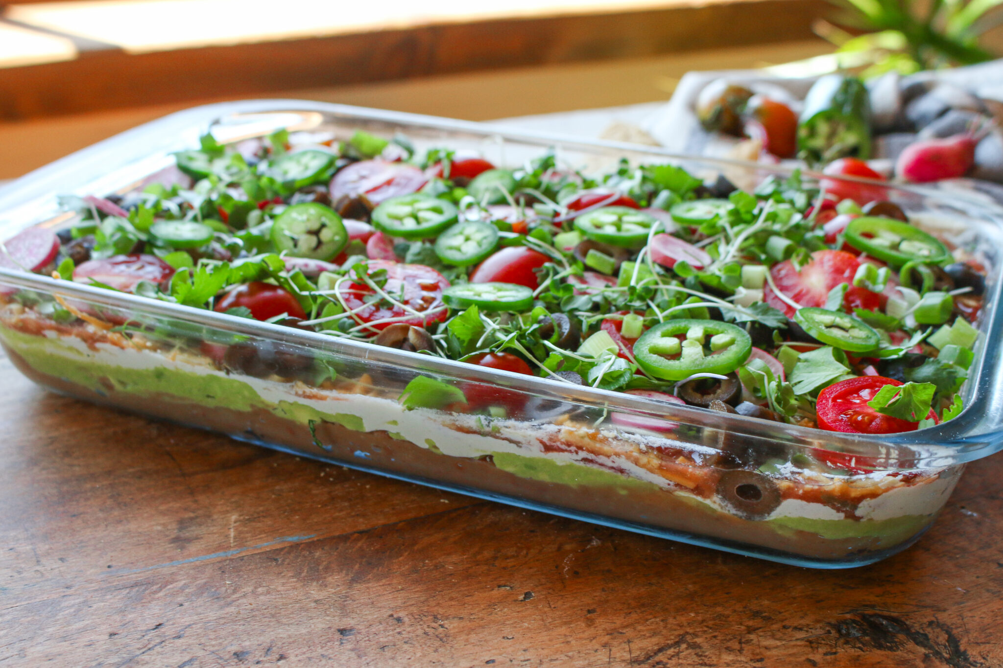 - Arrange 7 layer dip. Start by selecting a large platter (about 12-inches diameter) or shallow casserole dish (about 10 x 7 inches in diameter).