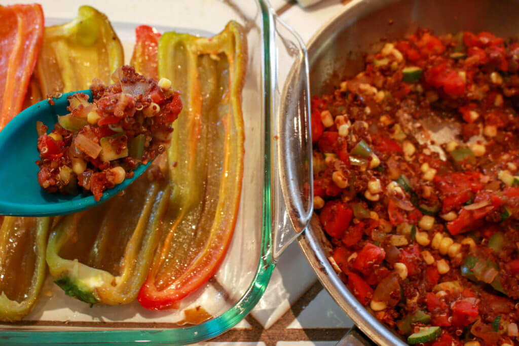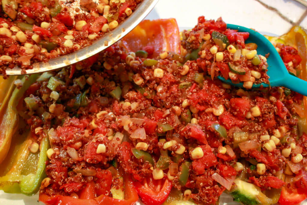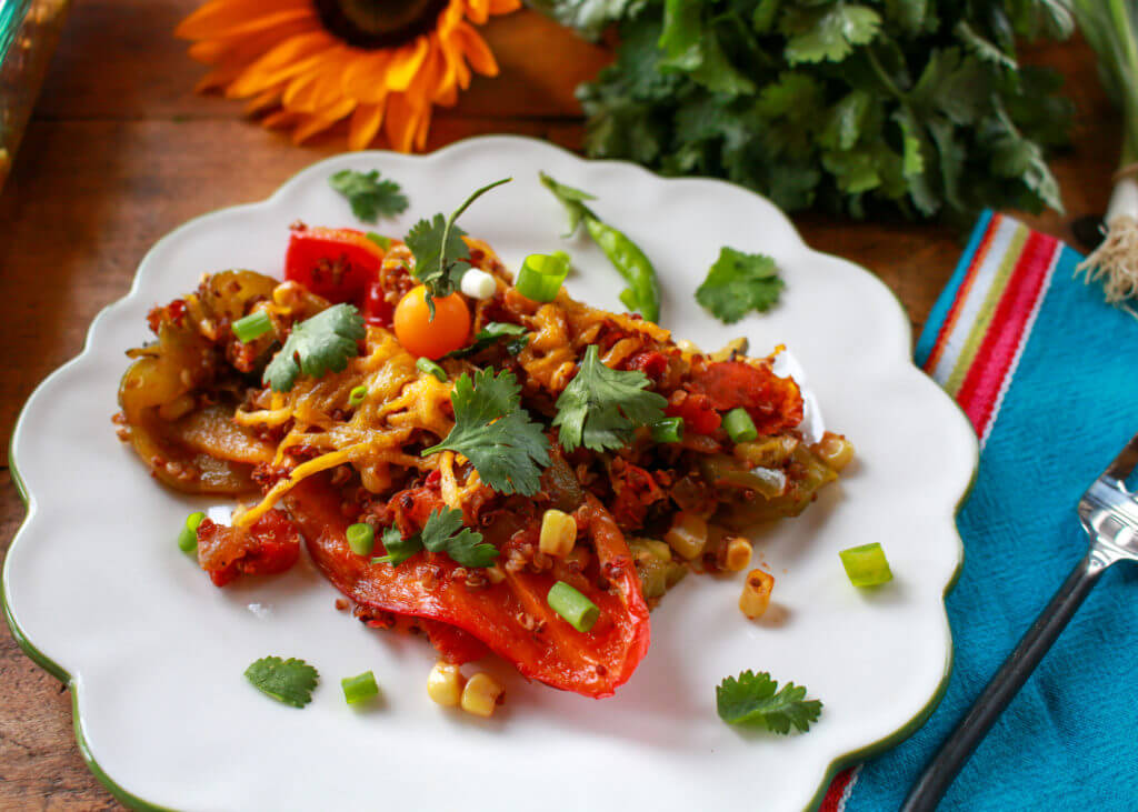 Slice Poblano chiles in half, scoop out seeds.Place with cut side down in baking dish, drizzle with EVOO, and broil for 5-10 minutes.When skin is slightly blackened, remove from oven and rest for a few minutes.Peel away the skins from the chiles with your fingers.Layer the roasted chiles on the bottom of the pan, with cut side up.Sauté onions, zucchini, garlic, bell pepper, spices, corn, cooked quinoa, and canned tomatoes until tender.Spoon the quinoa filling over the chiles.Spread evenly over the chiles.Cover with plant-based cheese and bake for about 30 minutes, until golden brown.Remove from the oven.Dish up into 8 servings and enjoy!