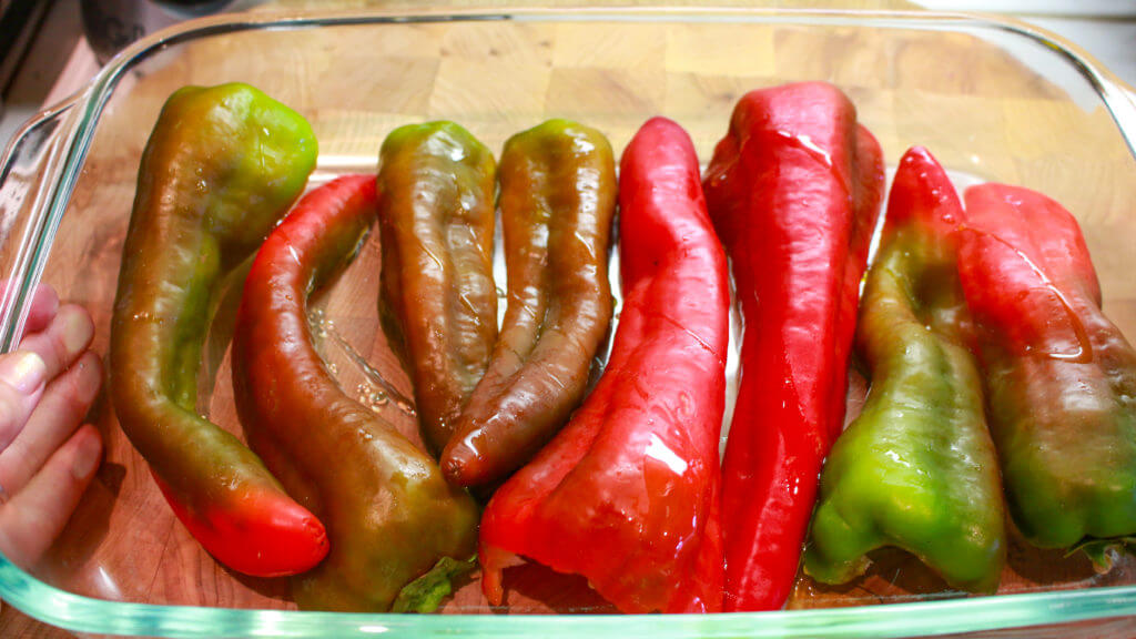 Place peeled, roasted chiles, cut side up, on the bottom of the baking dish.