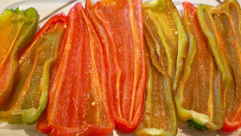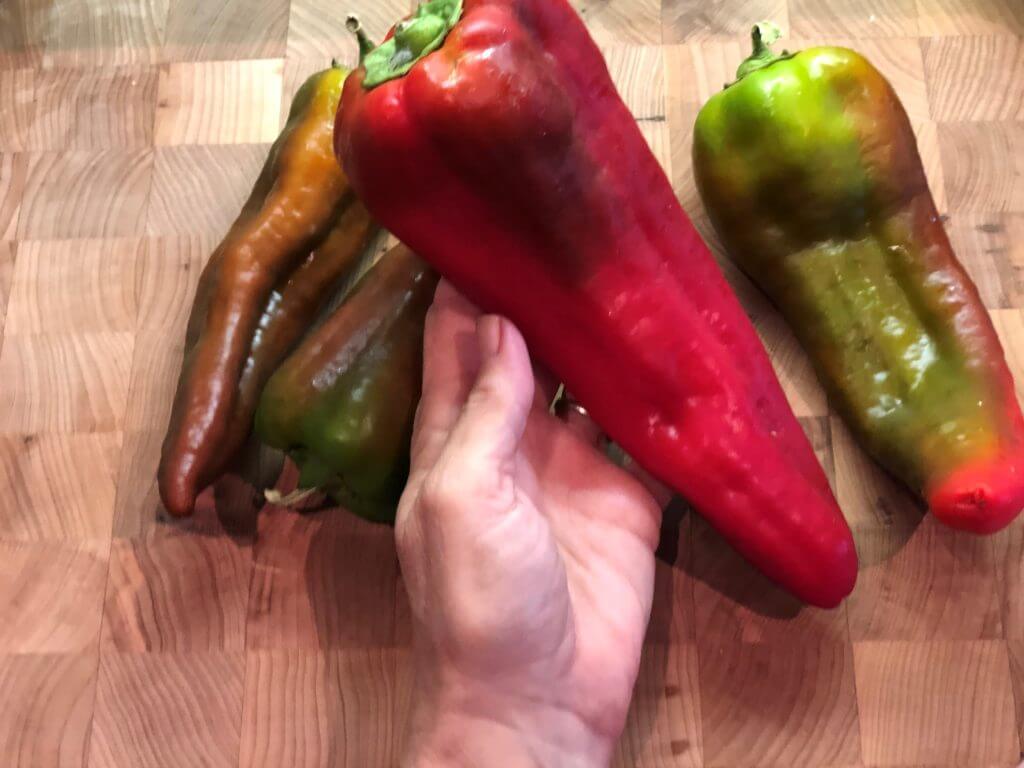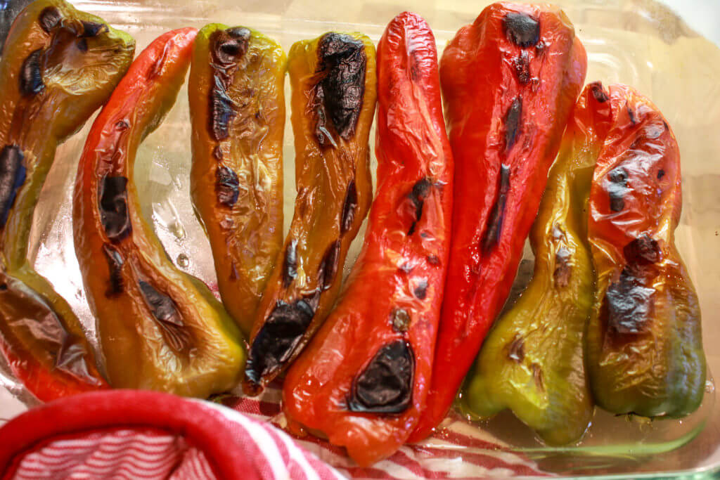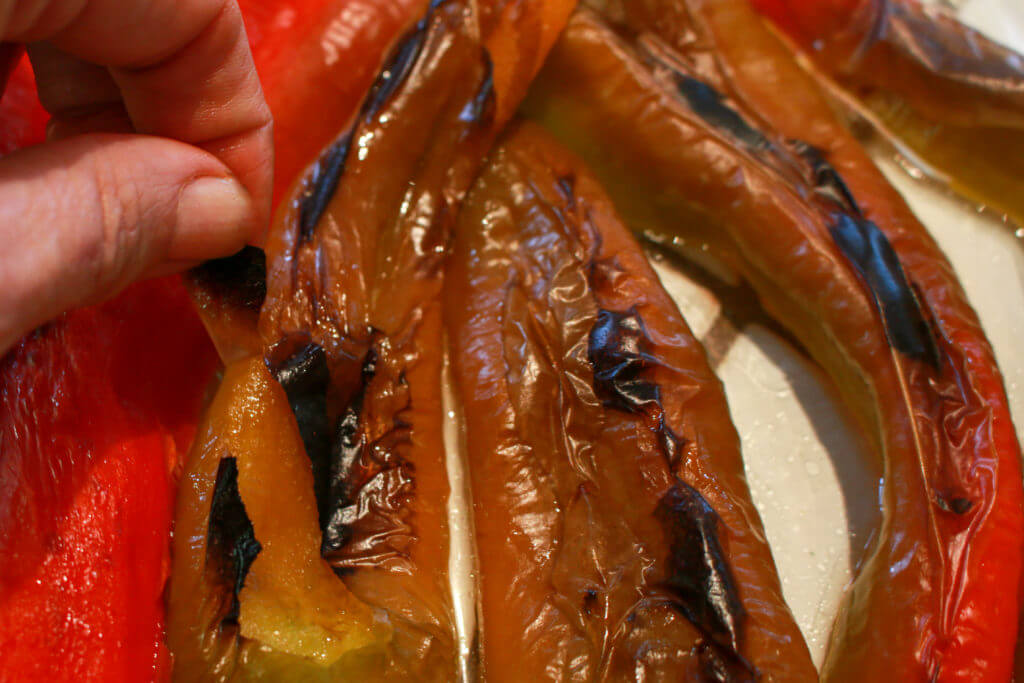 Remove from oven and let stand for a few minutes to cool slightly and sweat. With your fingers, peel away the skin and discard.