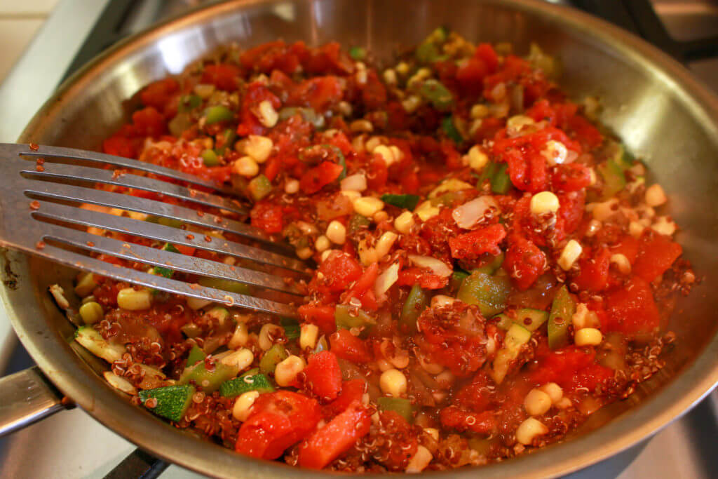 While chiles are roasting, prepare Quinoa Filling: Heat 1 teaspoon olive oil in a large skillet or sauté pan. Add onion, zucchini, garlic, and bell pepper. Sauté for 8 minutes. Stir in cumin, chili powder, corn, cooked quinoa, and tomatoes. Cover, and sauté for an additional 5 minutes, until vegetables are tender.