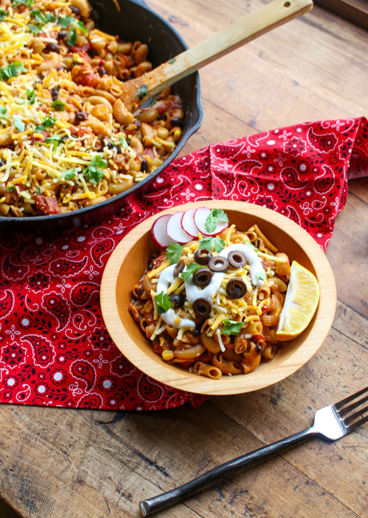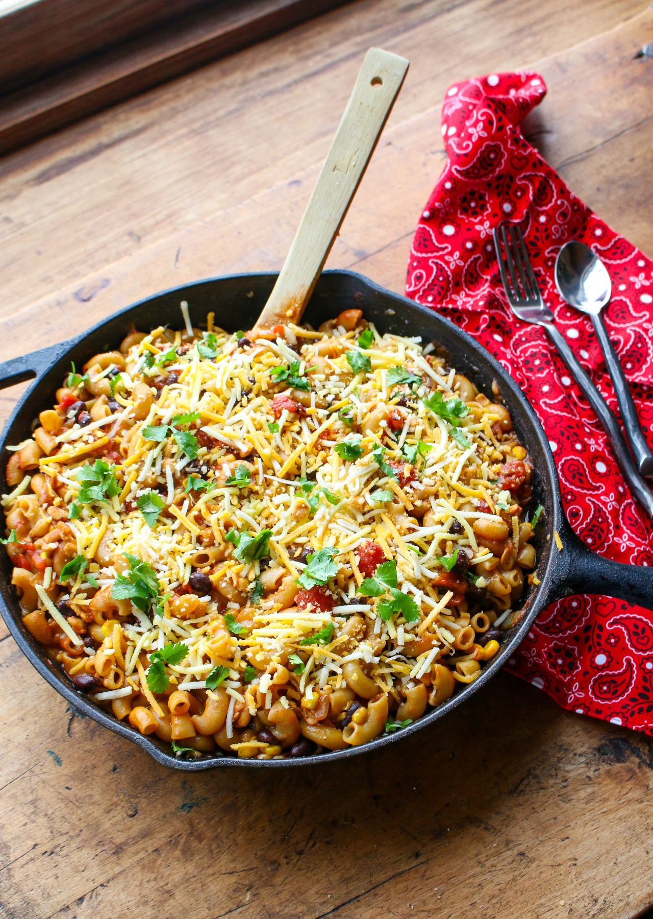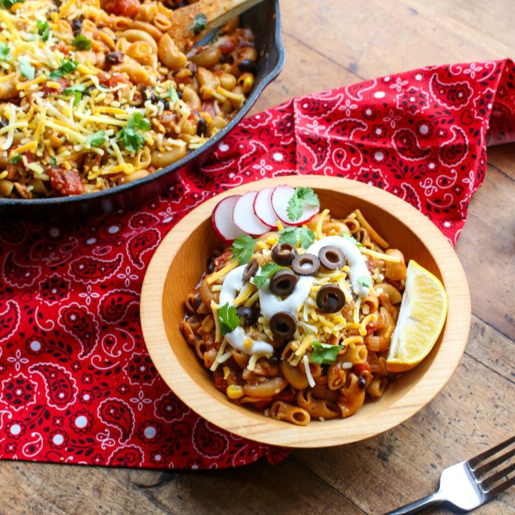 Get this delicious, budget-friendly, family-friendly, healthy, plant-based comfort food Vegan Chili Mac Skillet meal on the table in 30 minutes.