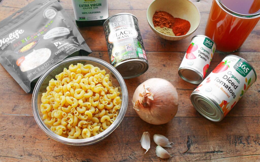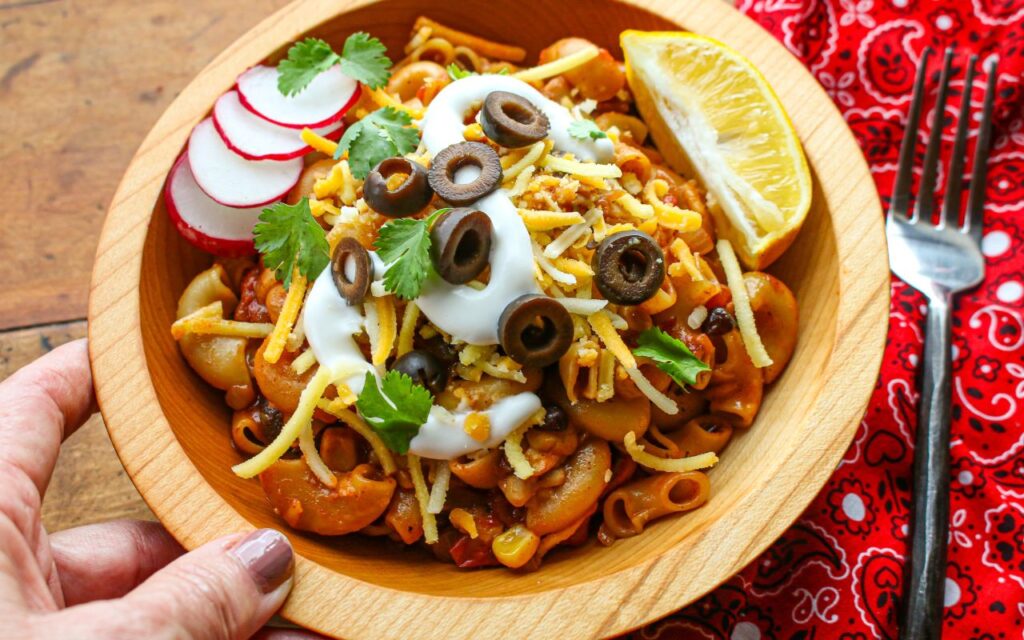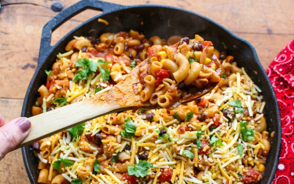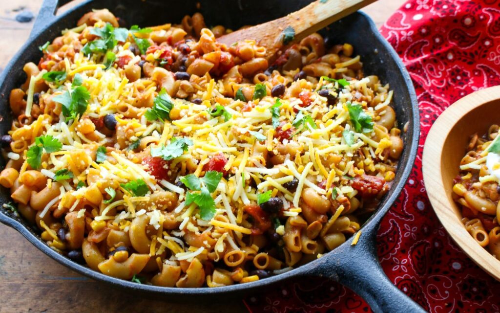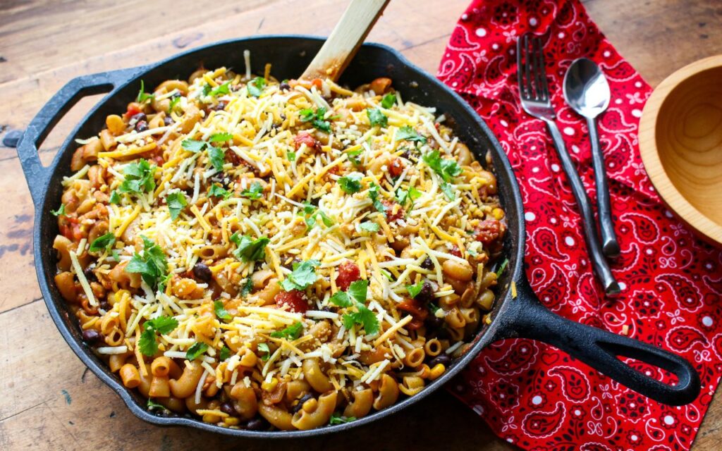 Get this delicious, budget-friendly, family-friendly, healthy, plant-based comfort food Vegan Chili Mac Skillet meal on the table in 30 minutes.
