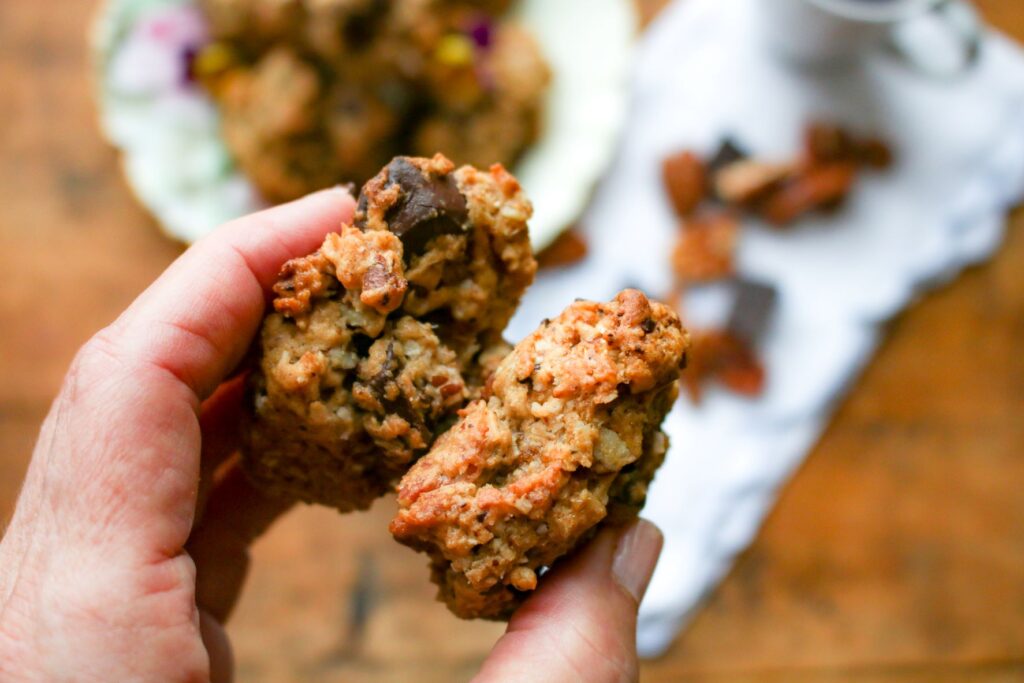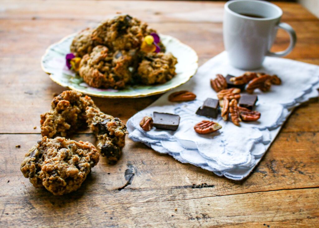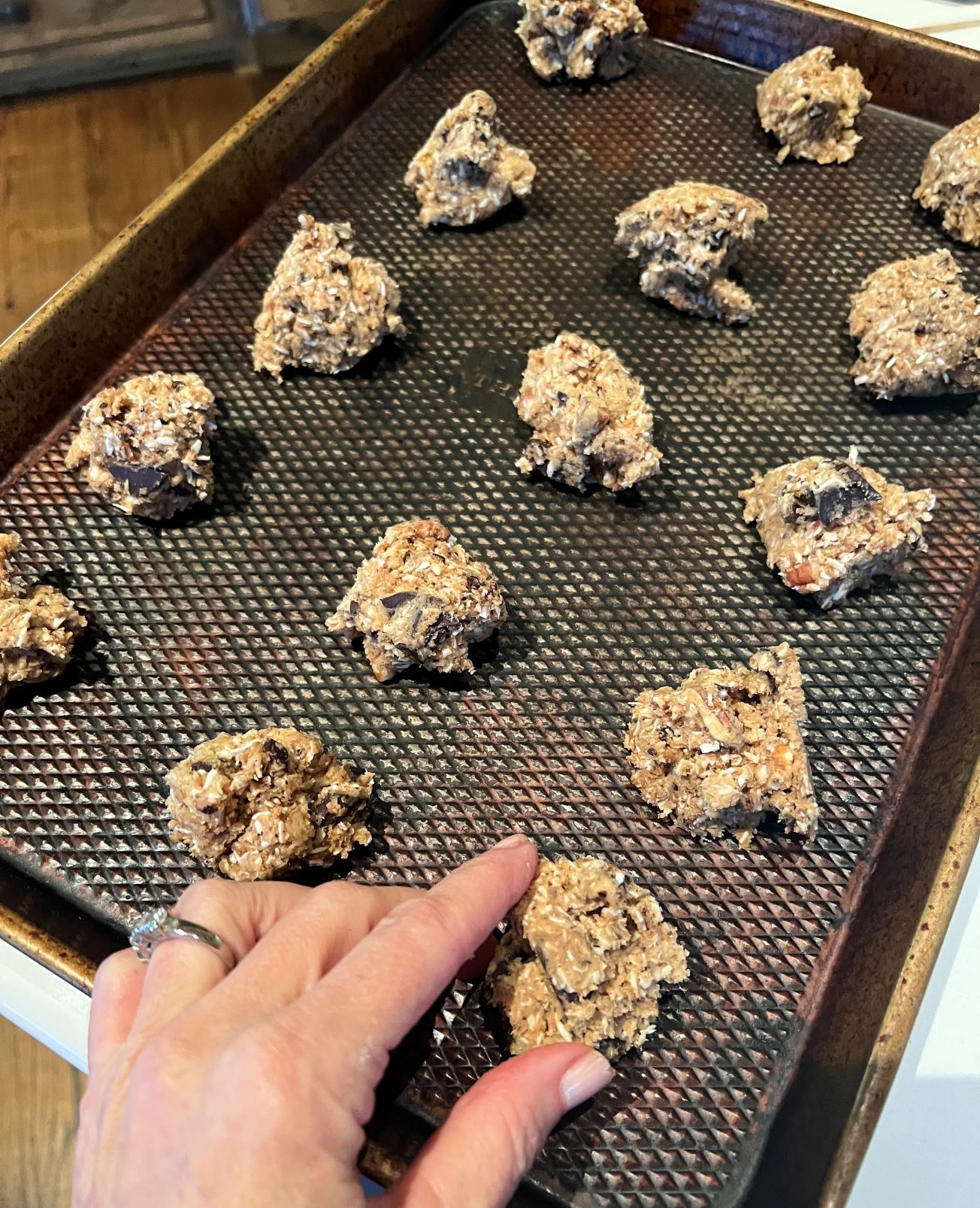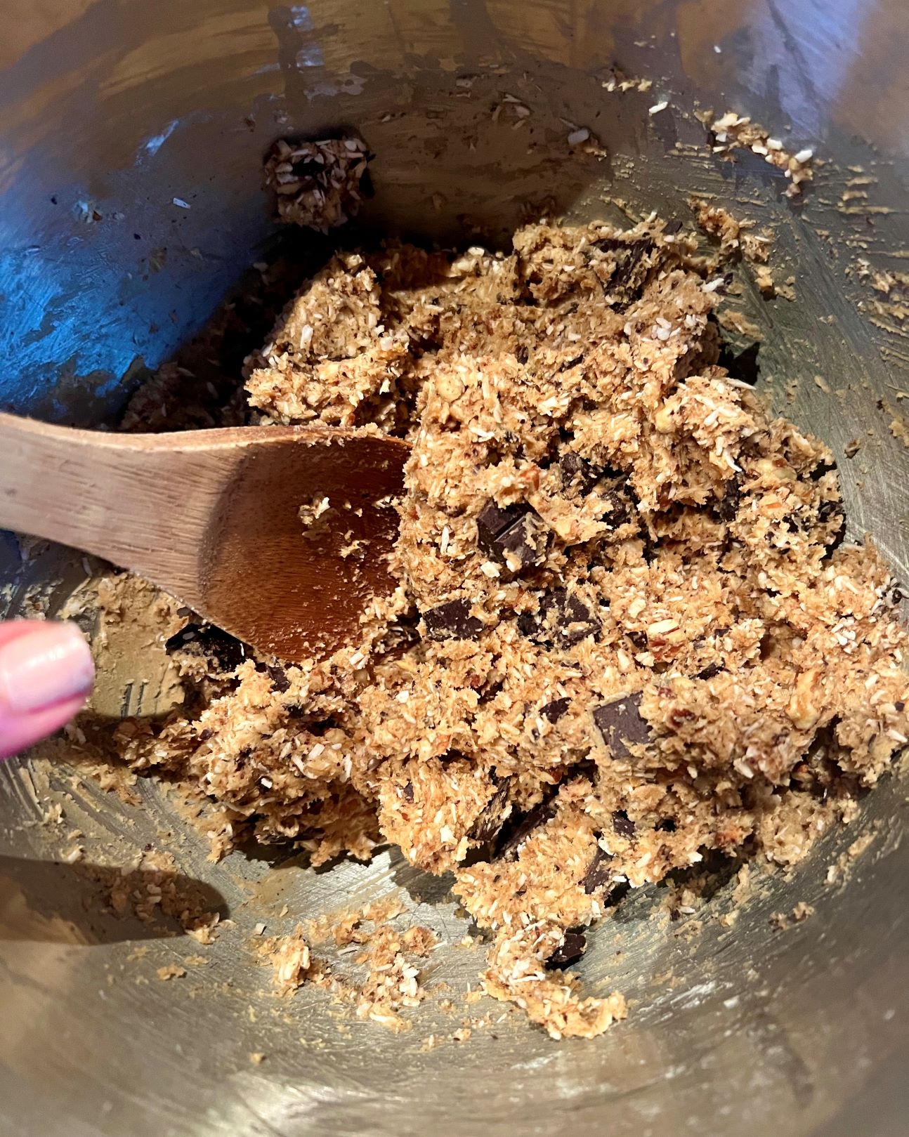 - Gently fold in coconut, pecans, and chocolate chunks.