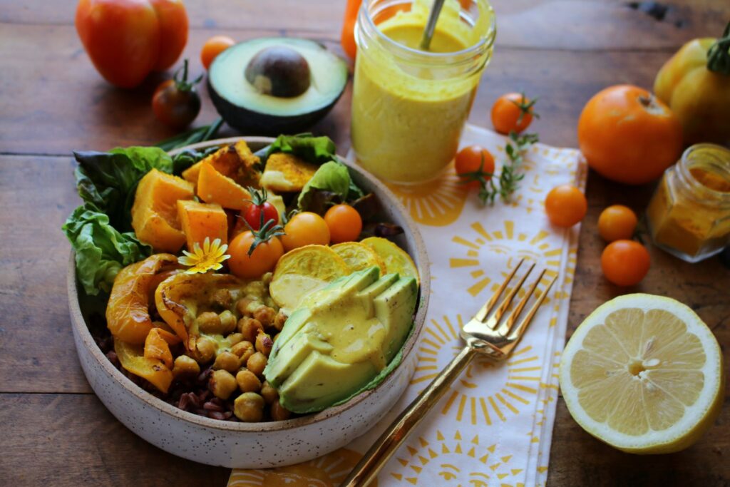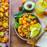 Turn the glow on in your life with this super healthy, yummy vegan glow bowl, which is warm with the golden shades of turmeric, squash, bell pepper, tomatoes, chickpeas, and avocadoes. It’s also gluten-free, and perfect for meal prep.