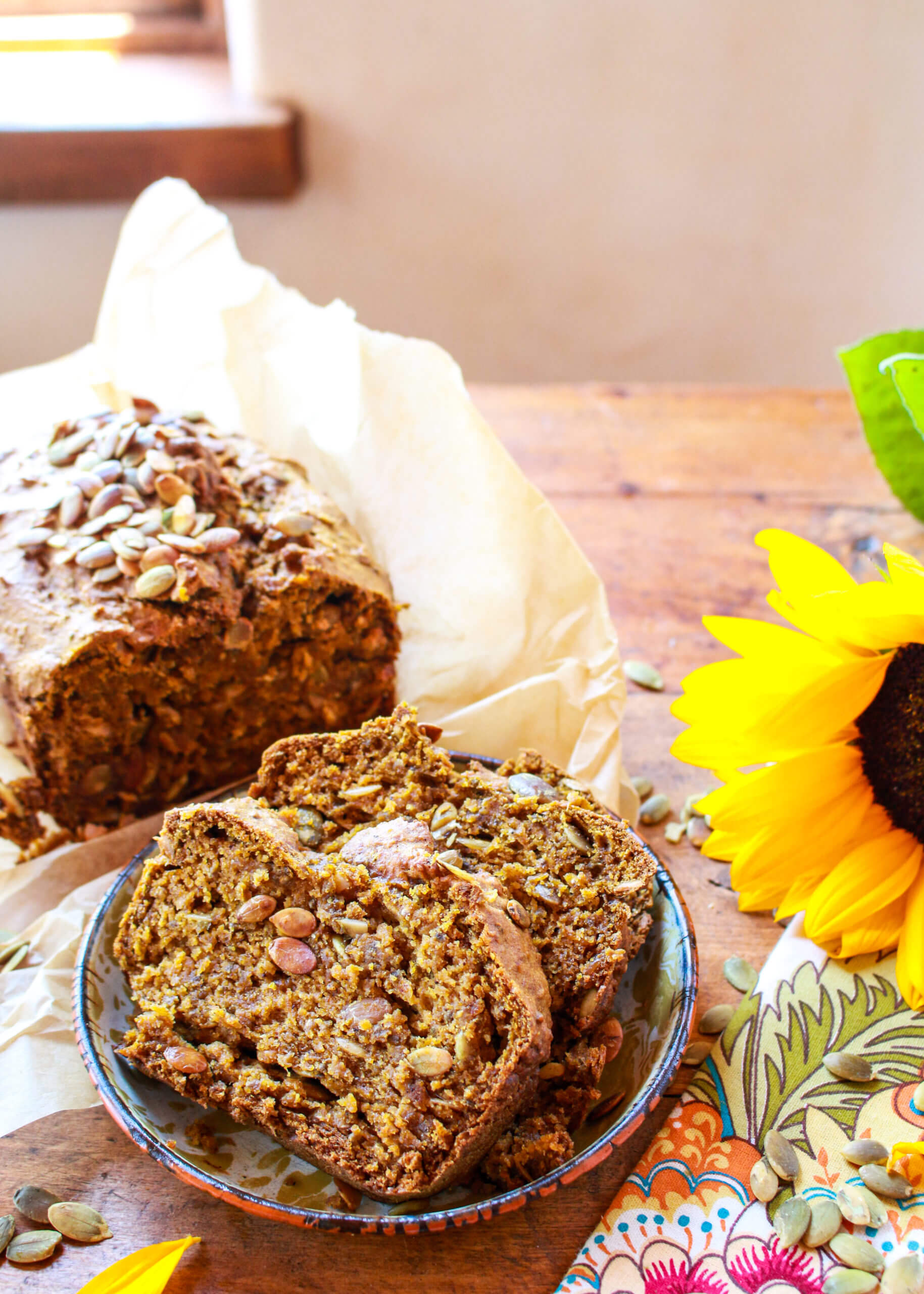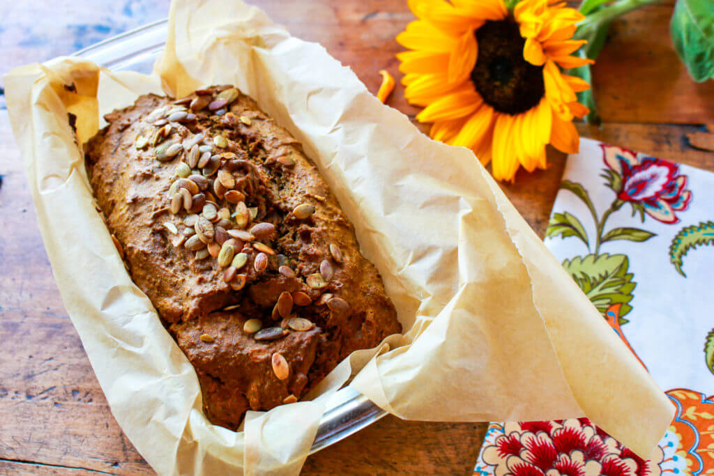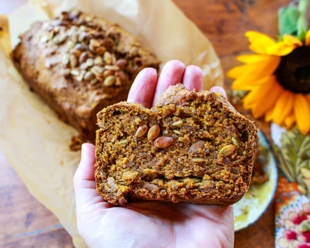 Make a rich, earthy vegan pumpkin bread with pumpkin seeds in a jiffy with this foolproof easy pumpkin bread recipe, which is light in added sugars and oils, and packed with moist, pumpkin-spice flavors.