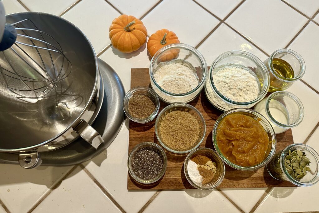 - Place pumpkin, plant-based milk, oil, chia seeds, and flax seeds in a large mixing bowl and combine with an electric mixer for 2 minutes (or beat by hand with a wooden spoon).