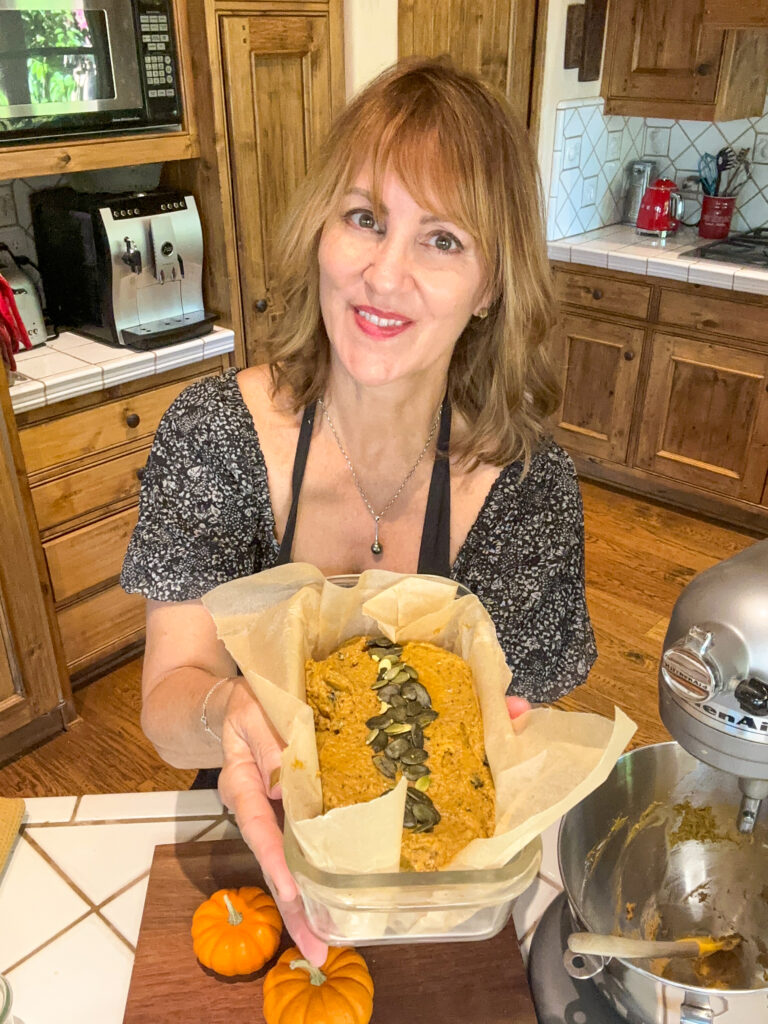 - Line a loaf pan with parchment paper. Pour batter into parchment-paper lined loaf pan, smoothing to even with a spatula. Sprinkle with 1 tablespoon pumpkin seeds, if desired (optional).