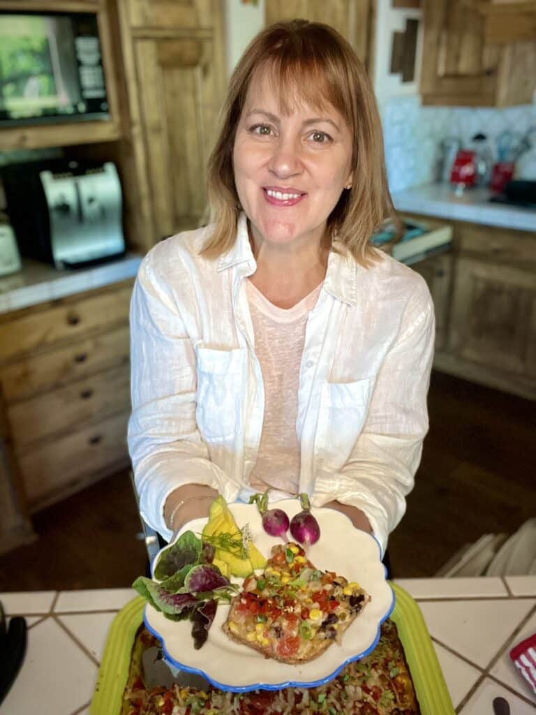 Looking for an easy plant-based, comfort food dish the whole family will love? You want to learn how to make tamale pie? Then, you must try this easy, yummy Vegan Tamale Pie recipe, which is a retro dish from my own mother’s kitchen years ago. My mother would make this easy plant-based recipe—which we would all greet with glee—many nights during my childhood. I took her classic, dog-eared recipe card and gave it a little bit of a healthier, more layered makeover, and I really love it. It’s great because you can literally whip up this recipe in less than 10 minutes and pop it in the oven to bake while you’re finishing up your dinner (a side salad is the perfect compliment). Use a cornbread mix to make it even easier! All you do is create a bottom crust of corn bread batter, and then top it with beans, veggie “meat” crumbles, onion, corn, salsa, plant-based cheese, green onions, and cilantro. The flavors meld together in the oven into golden, rich, satisfying perfection.