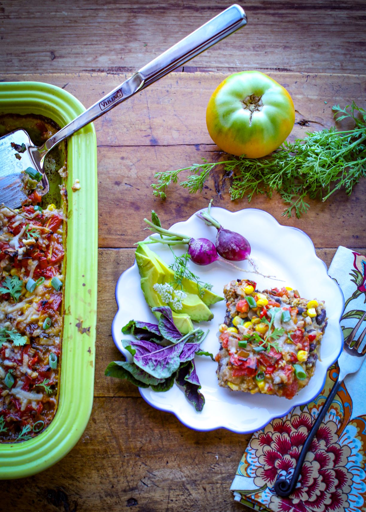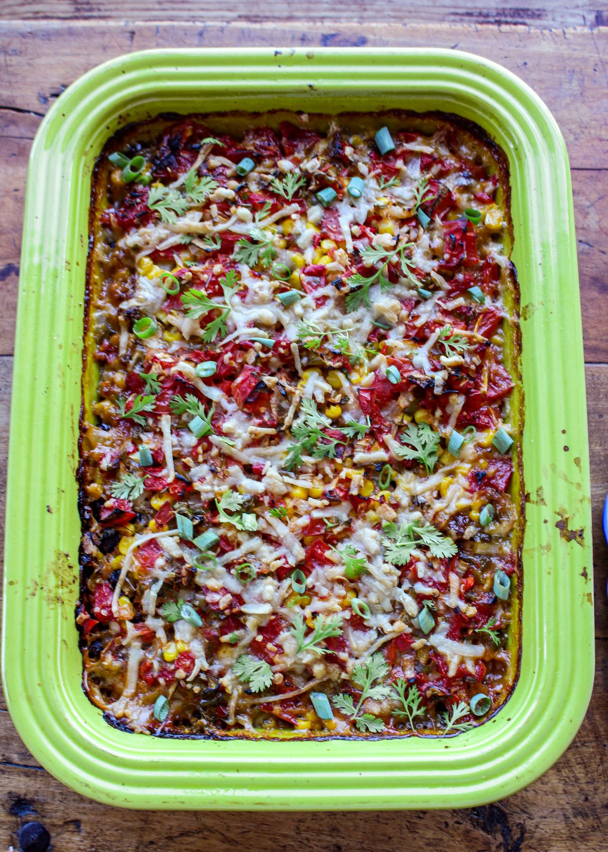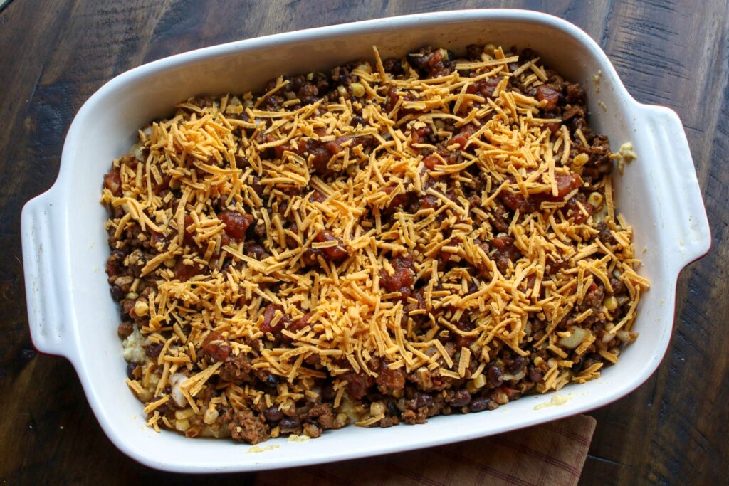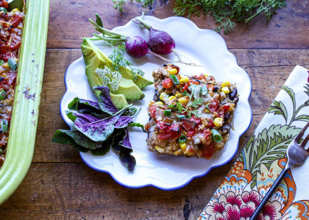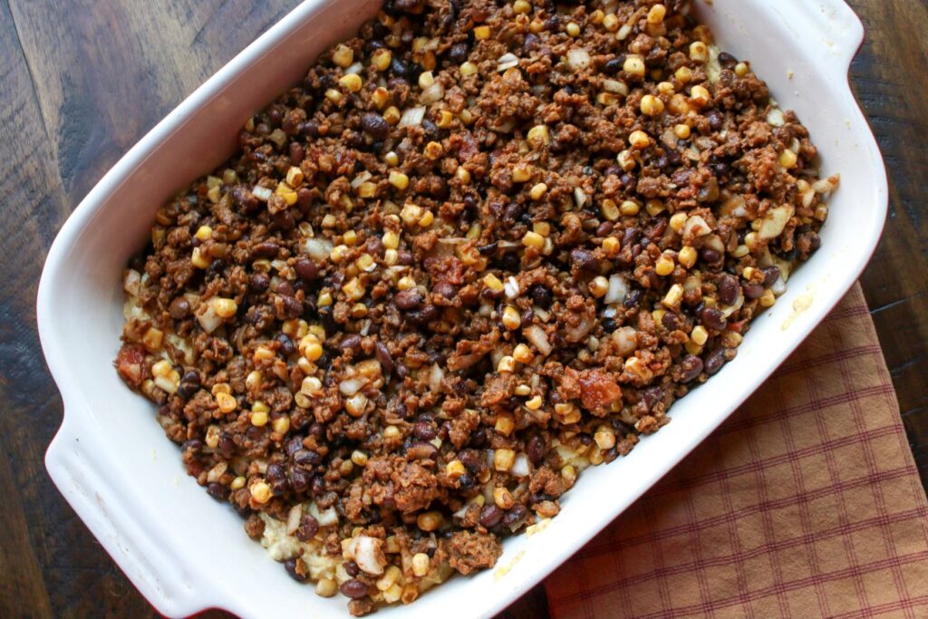 Spread cornbread batter on the bottom of the dish.Top with beans, veggie “meat” crumbles, onion, corn, and salsa.Sprinkle with plant-based cheese (try cheddar style or Monterrey jack) and bake.Garnish with green onions and cilantro. Voila!