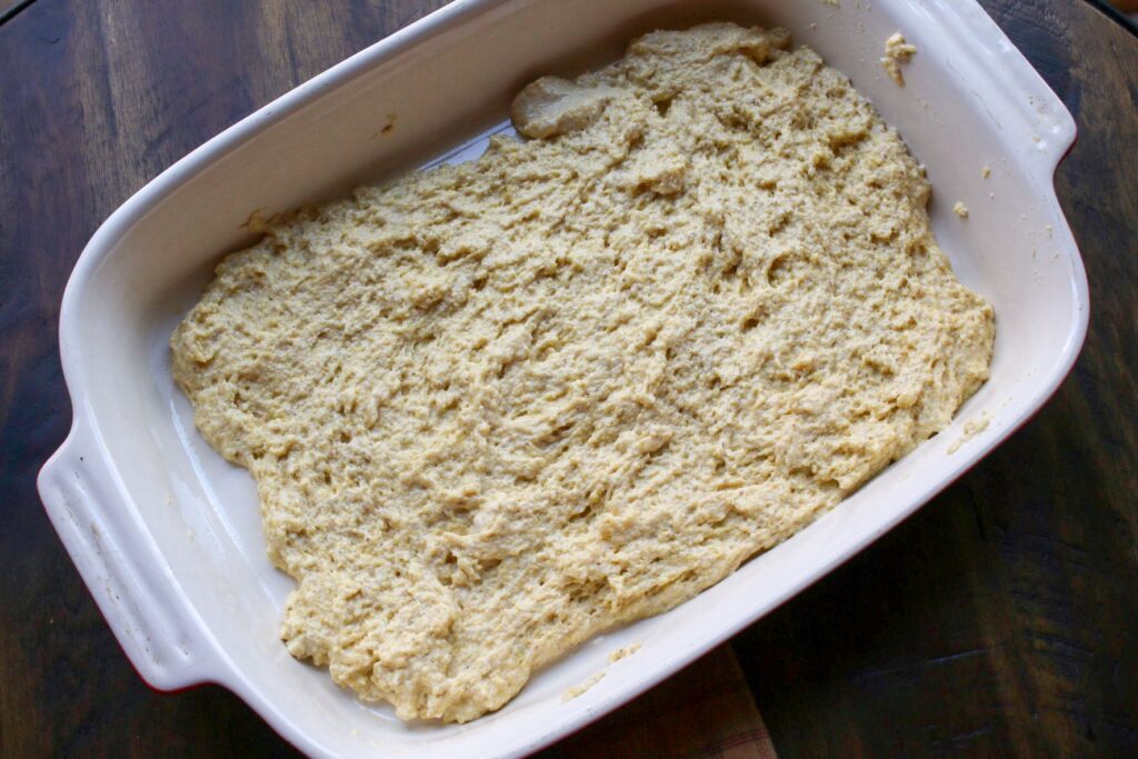 Pour cornbread batter into the bottom of the dish to make a thin layer.