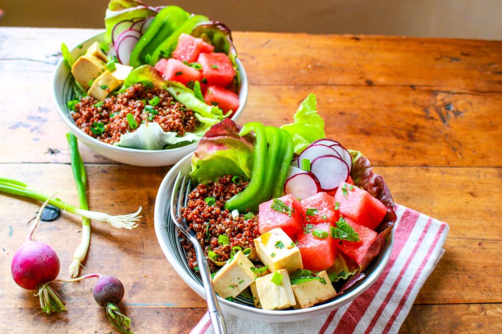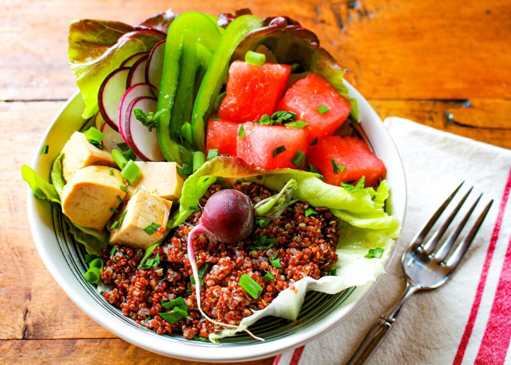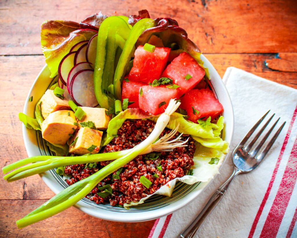 Create your own vegan poke bowl recipe with delicious, juicy, pink cubes of watermelon, marinated tofu, quinoa, and crunchy veggies.