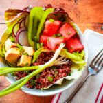- While tofu and watermelon are marinating, prepare salad ingredients.