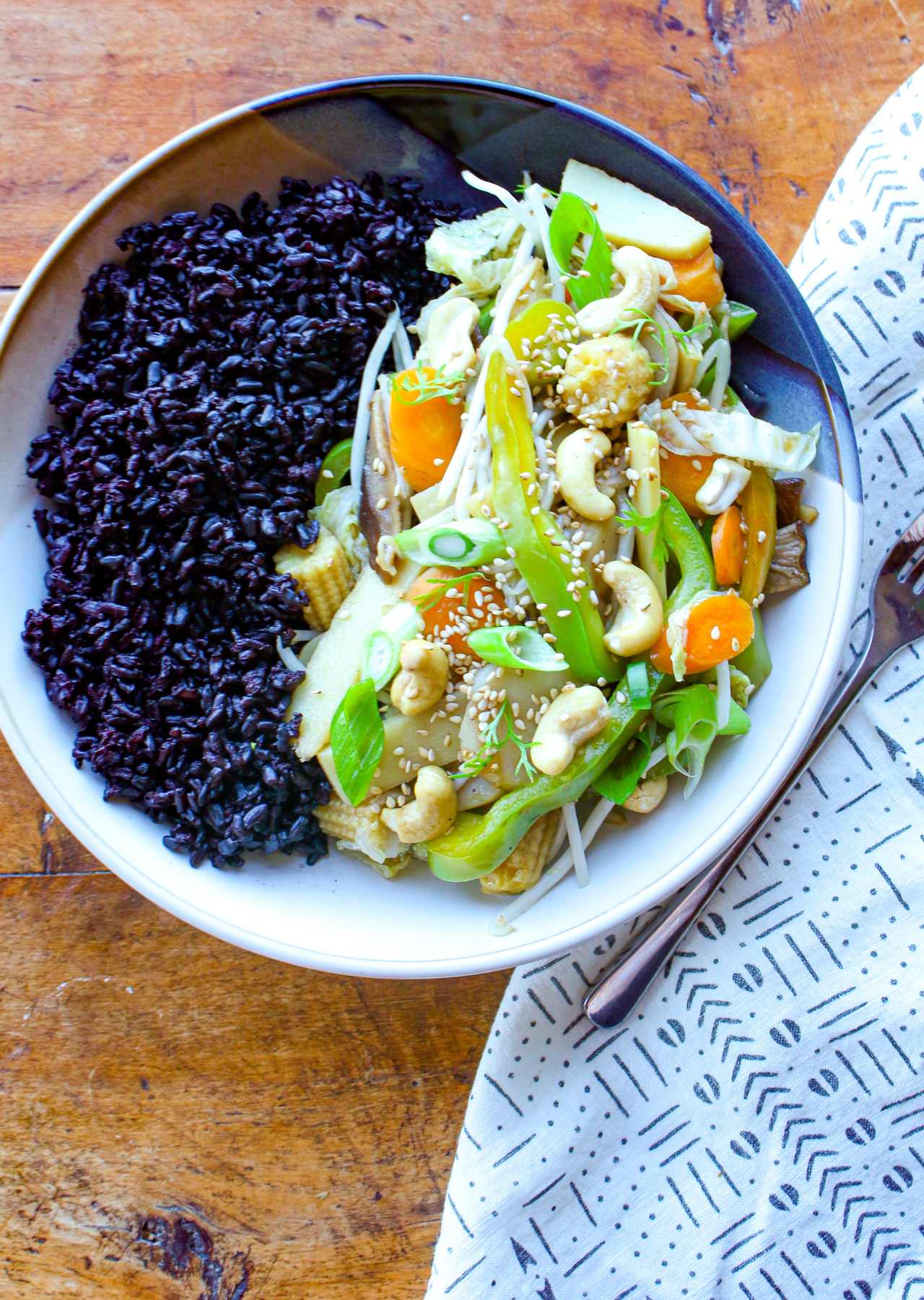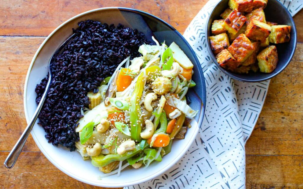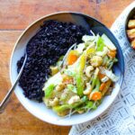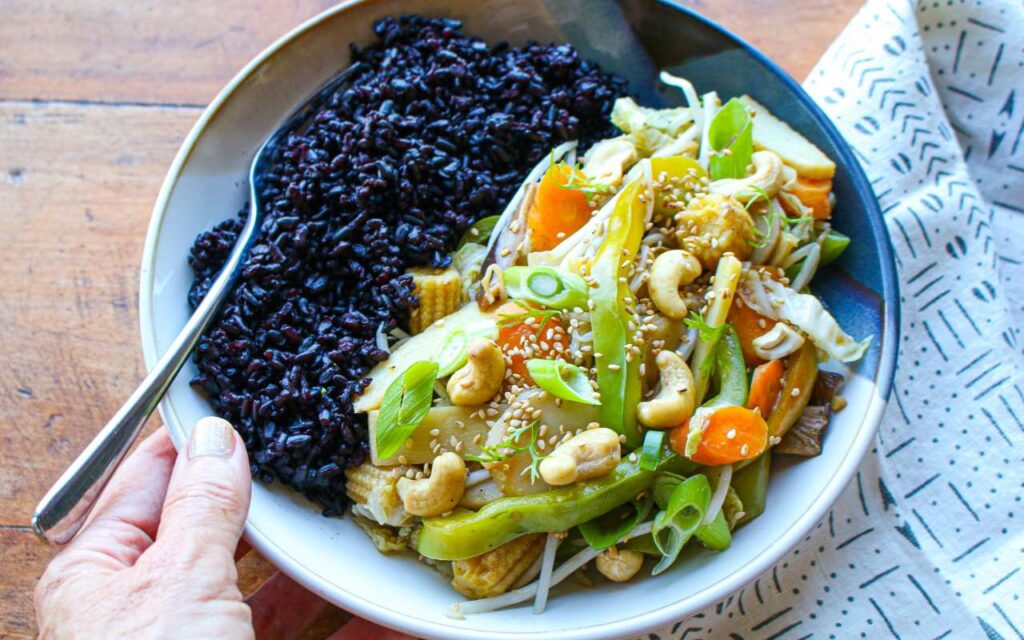 This easy, nutritious Vegetable Stir Fry with Forbidden Rice recipe is vegan, gluten-free, and it’s packed with flavor and color. Add tofu or tempeh to make it a meal.