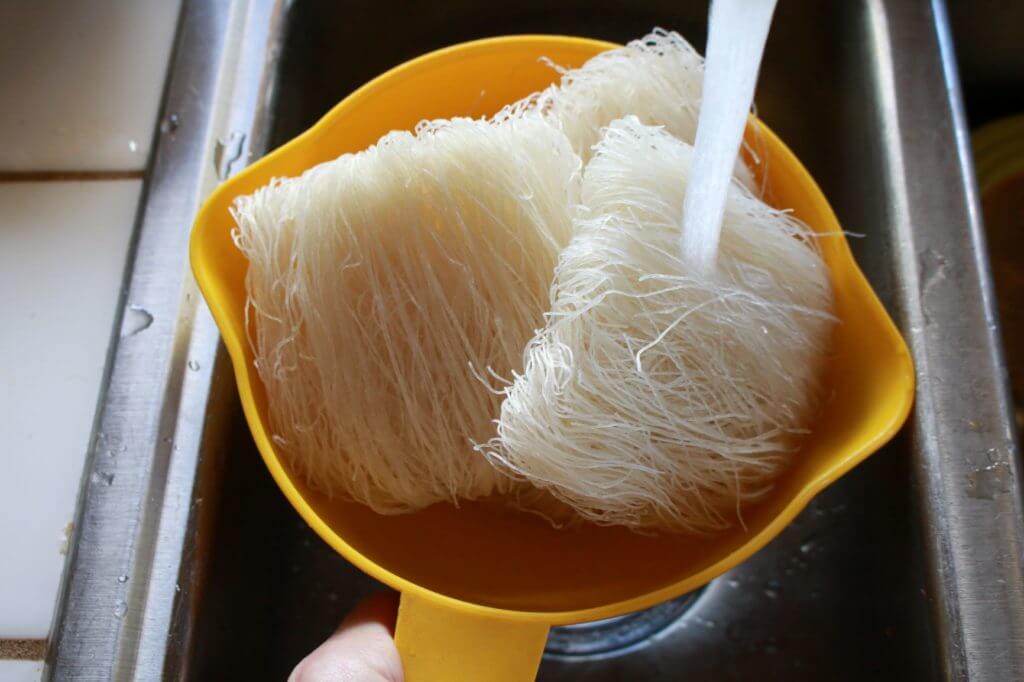 - Break dried noodles in half and place in a colander. Rinse with water for a minute or two until slightly soft.