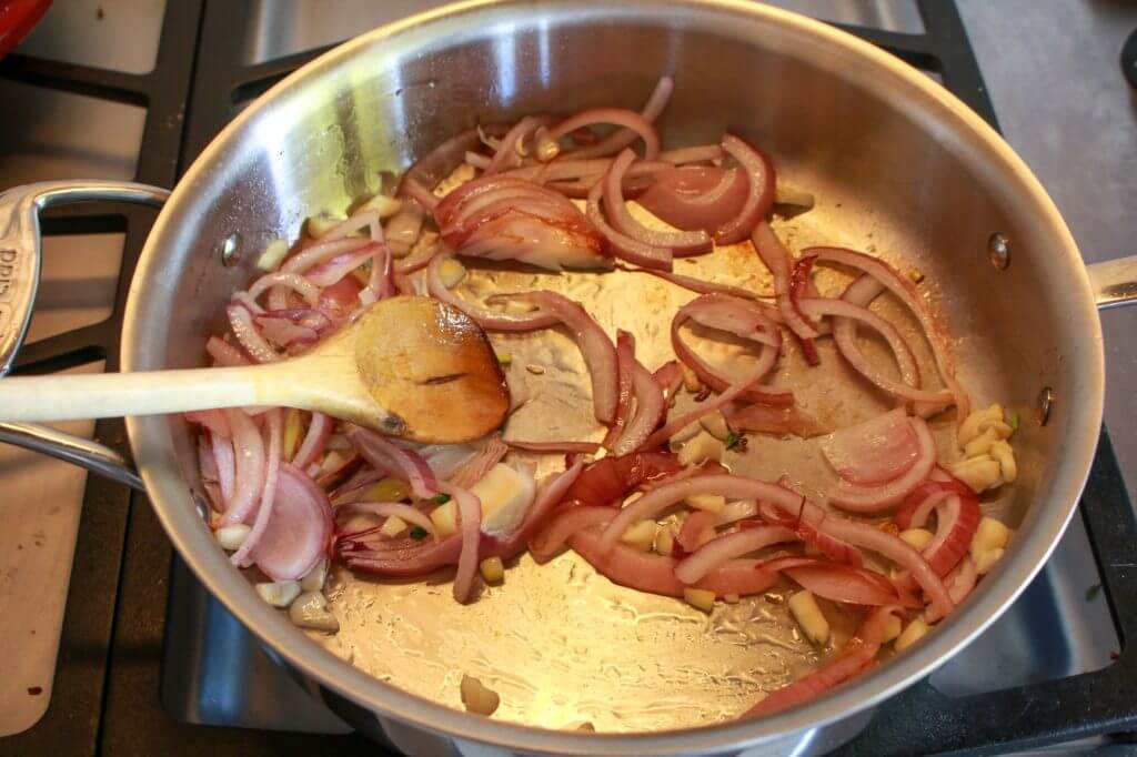 - Heat oil in a large pan, skillet, or wok over high. Add garlic and onion and stir-fry for 4 minutes.