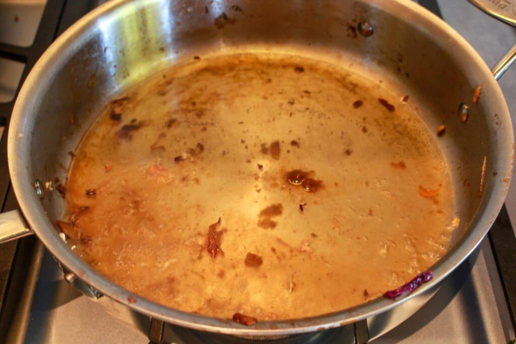 - Add 1 cup broth to the same pan and heat until bubbly.