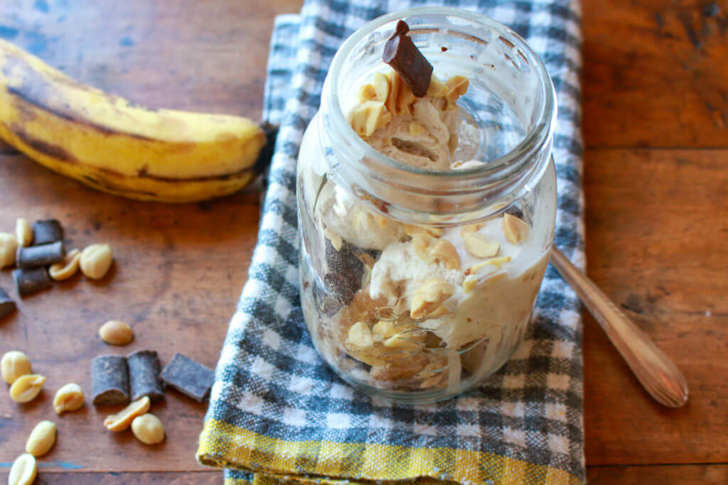 It’s so easy! Just layer the ingredients (oats, cinnamon, brown sugar, chocolate, peanuts) in an oven-proof individual glass container, give it a shake, bake it in the oven til golden brown, then remove and top with plant-based ice cream and garnish with additional peanuts and chocolate if desired. This rustic combo is downright delicious! While my favorite plant-based ice cream for this recipe is vanilla, you can choose whichever you like. Try my own recipe for vegan nice cream here. Fun bonus: Let your guests make their own banana split, put it in the oven, and top it as they like for an interactive treat for parties. This recipe is also a hit among kids (and adults, really). Let’s dive into this warm twist on a classic that’s sure to become a staple in your vegan dessert rotation!