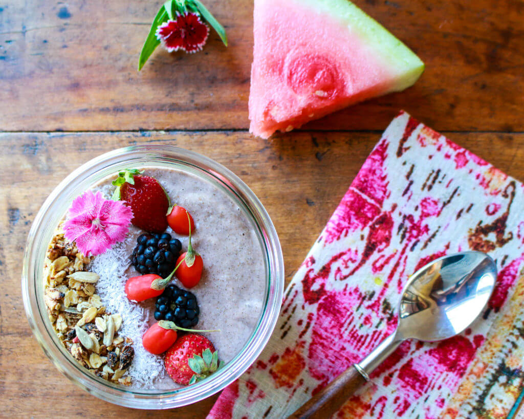 The chia seeds create a gel-like consistency, thickening up the smoothie bowl to a creamy texture. If you chill it overnight, it will be even more firm—providing a thick, spoonable texture. Plus those chia seeds are packed with protein and healthy fats. You can get this recipe done in under 10 minutes! Great for meal prep too.