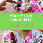 A cool, silky, nutritious smoothie—poured in a bowl and adorned with flavorful toppings—what’s not to love about the smoothie bowl trend? It’s the perfect light, satisfying breakfast, lunch, or snack. This vegan, gluten-free Watermelon Chia Ginger Smoothie Bowl calls upon a blend of sweet watermelon, creamy bananas, spicy ginger, and chia and hemp seeds—topped with a creative combo of berries, coconut and granola—creating a balanced, healthy meal to kick start your day. Pour it into a glass jar, top it, and tote it along for a meal on the go. Everyone will be ogling your gorgeous plant-based creation for sure!
