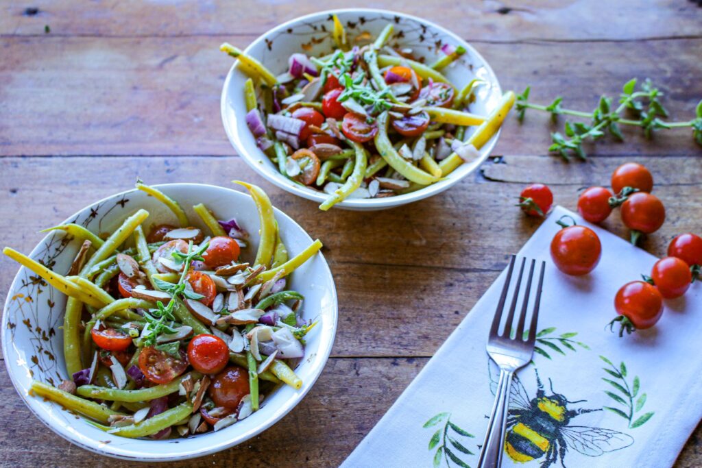 - Mix olive oil, lemon juice, black pepper, salt (optional), oregano, and garlic in a small dish. Pour over the wax bean salad mixture.