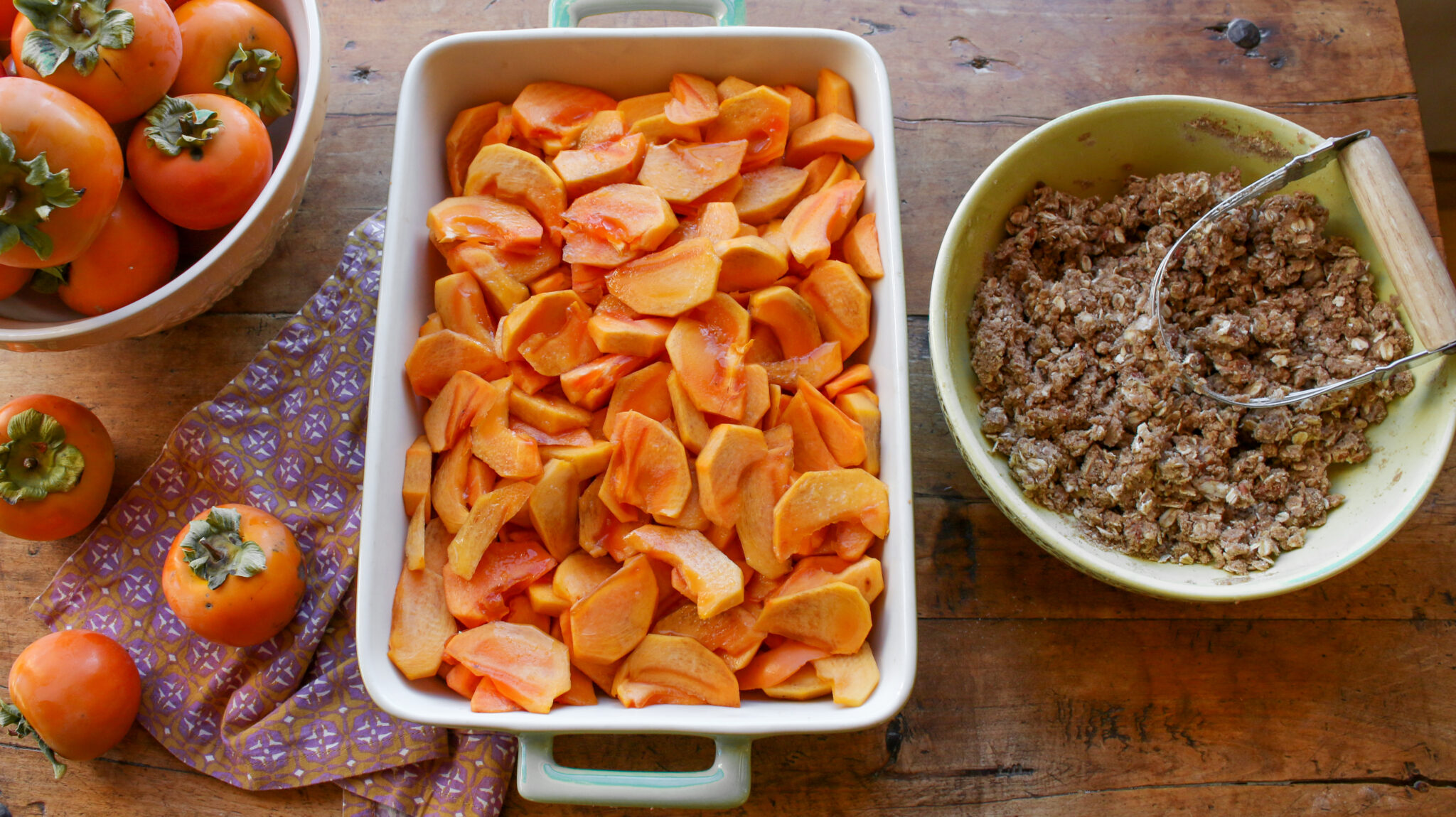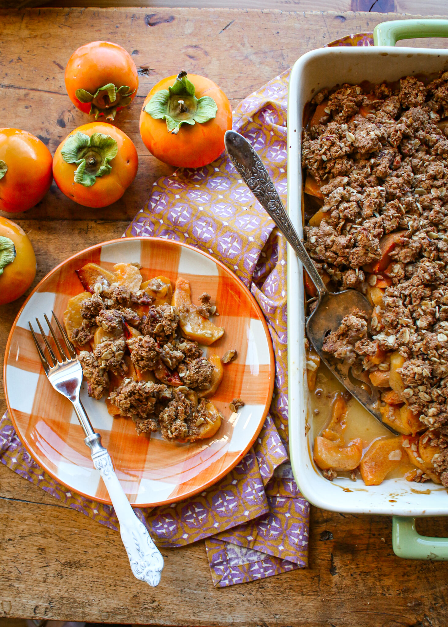 Celebrate persimmon season with this Healthy Vegan Persimmon Crumble—a cozy, wholesome dessert that’s as nourishing as it is delicious. Made with fresh ripe persimmons, rolled oats, whole wheat flour, toasty pecans, and warm spices, this crumble is low in added sugars, moderate in healthy fats, and packed with whole-grain goodness. It’s the perfect balance of sweet and spiced, with a golden, crunchy topping over irresistible persimmon fruit. Easy to make and entirely plant-based, this persimmon oat crumble makes a beautiful fall or winter treat—serve it warm straight from the oven for a simple, satisfying, and healthy dessert everyone will love. And did I mention it’s fabulous for the holidays, from Thanksgiving to Christmas!